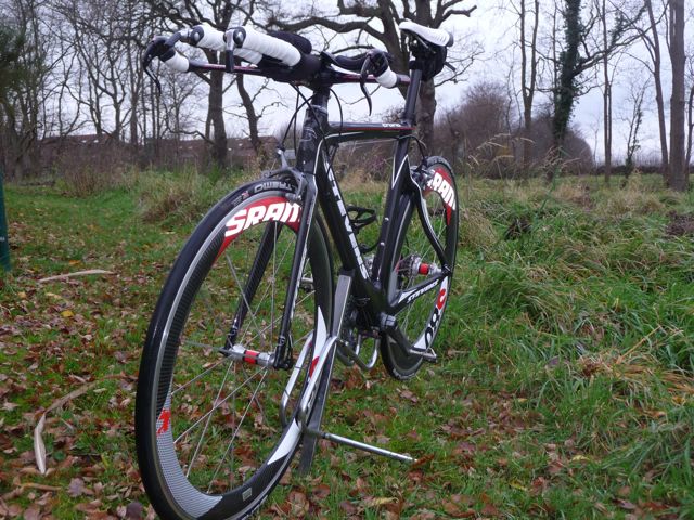 Der Rahmen kann also so schlecht nicht sein. Habe mich jedenfalls gleich wohlgefühlt. Lenkt sich wie ein gutes Rennrad, obwohl man ziemlich vorne liegt. Und die Laufräder sind sowieso gut. Wenigstens, wenn man keinen Bock auf Schlauchreifen kleben hat.