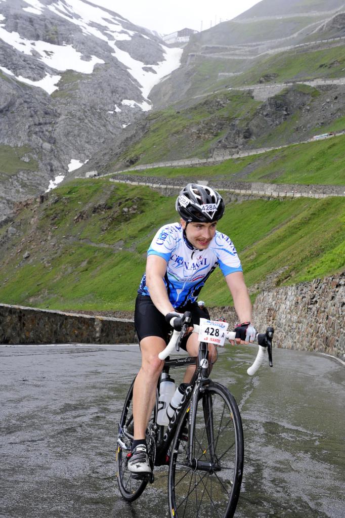 2753 m überwunden werden sollte. Der Anstieg zum Stelvio, so wie er in Italien heißt, begann bei Kilometer 41 und endet nach 27 Km. Die ersten Kilometer des Anstiegs waren mit einer Durchschnittssteigung von 3 bis 6 % recht gleichmäßig, was sich allerdings endete, als man ein Platoo nach einem Waldstück erreichte, da ab hier die Straße in massivem Fels geschlagen war, das sah beeindruckend aus. Von der Passhöhe begann eine längere Abfahrt, welche in einem kleinen Flachstück endete. Der Schlussanstieg zum Foscagno mit seinen