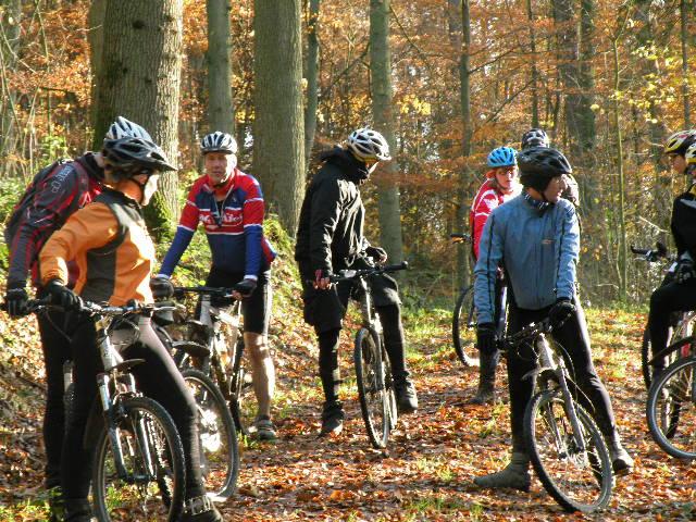 Die Wege können wunderschön matschig sein, die Tiefe der Schlammlöcher ist durch überdeckendes Laub nicht erkennbar, kreuz- und querliegende Äste sind gekonnt drapiert, besonders stolz ist die Organisation auf die zu überquerenden riesigen Buchen, deren Zahl unterschiedlich mit 4, 6, 7, 8 angegeben wird. Es waren jedenfalls viele, für mich schienen sie ohne Hilfe unüberwindbar. Sonst habe ich mich aber gut geschlagen – ganz in kurz - erst in der Gruppe von Gerald, da war ich noch bärenstark, dann Stephan und schließlich Bärbel, die aber strampelte vorwärts wie um ihr Leben und war mir auch noch zu schnell. Aufgefallen ist das kaum, gab doch der Antrieb meines Rades einige unwillige Geräusche von sich, die mein Schwächeln auf das Material lenkten. Ach ja, von der RG Kiel von 1896 waren noch die Rennfahrer Calli und André da, dem einen fehlte die Luft (in den Reifen), dem anderen die Puste (allerdings in Gruppe 1). Es ist eben der Bungsberg, wenn schon kein richtiger Berg, dann um so mehr Schmodder, dafür war es wenigstens nicht staubig.